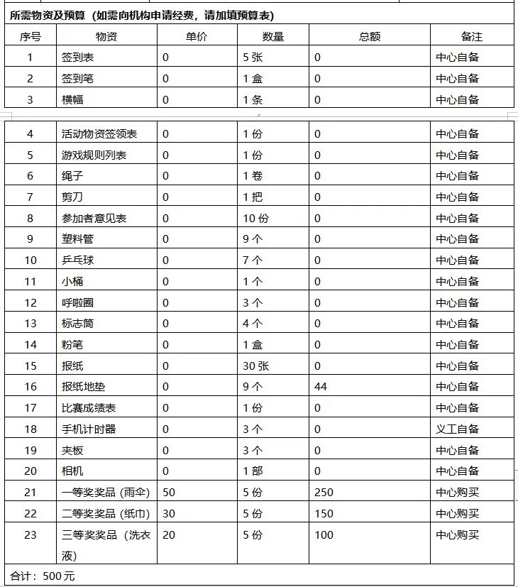 (四)所需资料:活动物资需具体到所有用到的道具的名称及数量。示例:签到表1张、签字笔1盒、粉笔1和、绳子1卷……