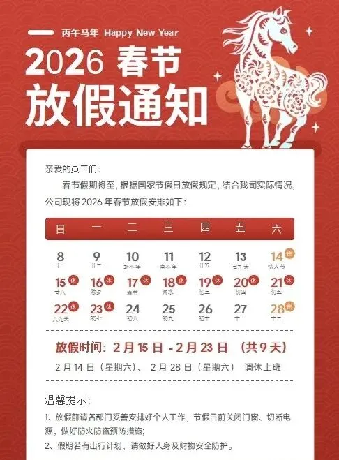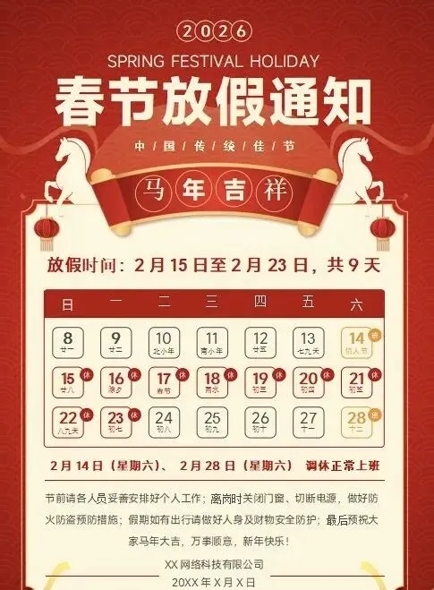 2026马年春节放假通知模板|word可编辑