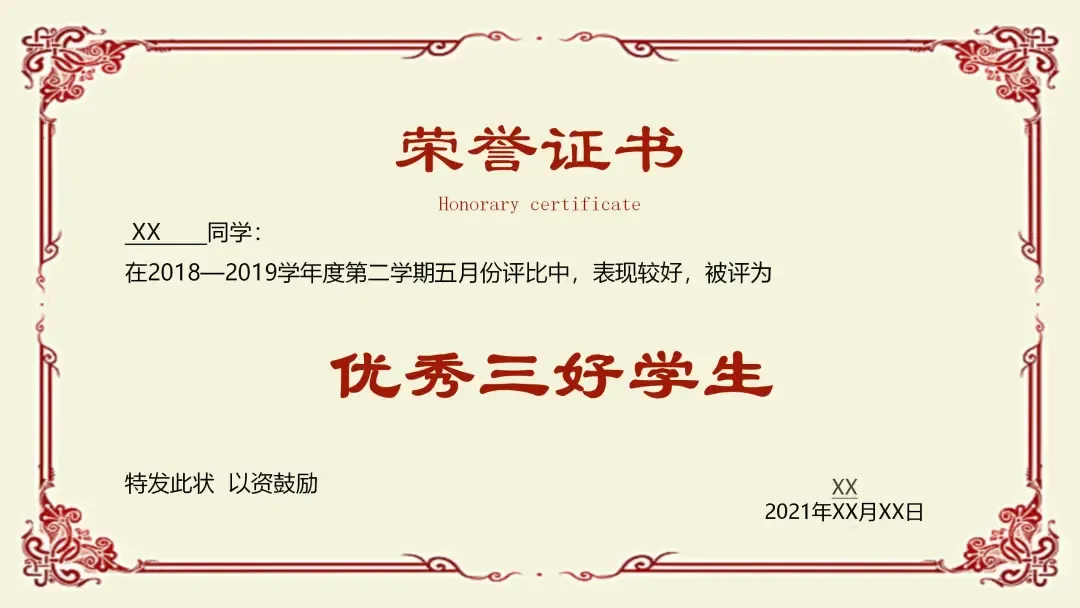 一、学习类荣誉证书:包括三好学生、优秀学生干部、学习标兵、进步之星、学业优秀奖、阅读之星、文明学生、班级贡献奖、创新实践奖、优秀作业奖、勤奋学习奖、自律之星、优秀班干部、优良学风奖、学习之星等。
