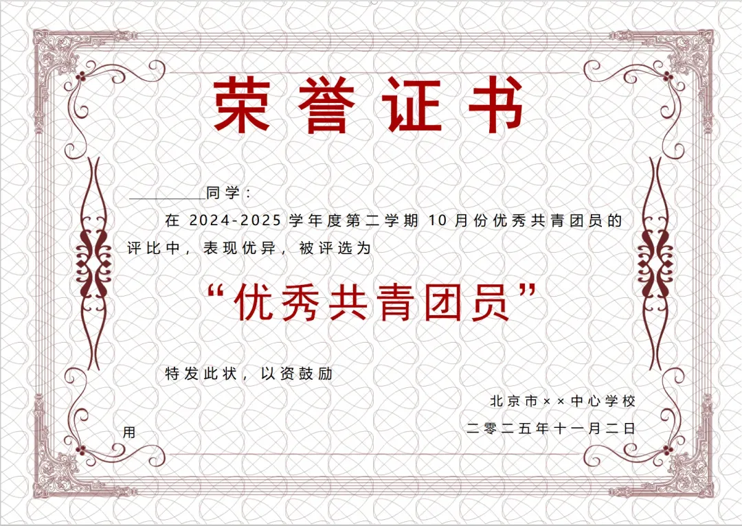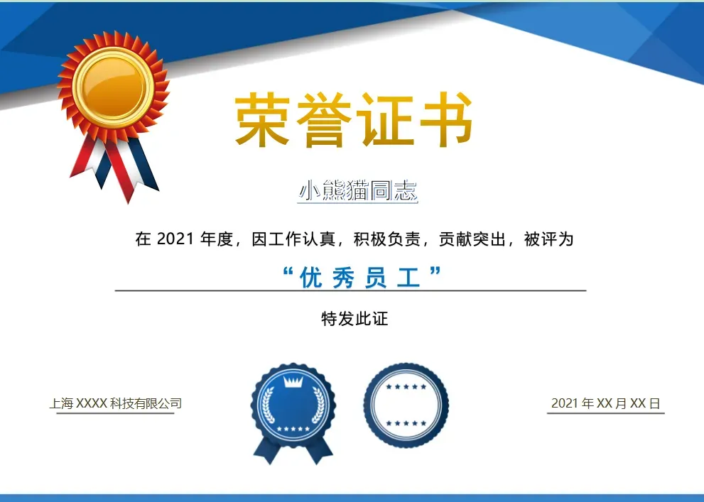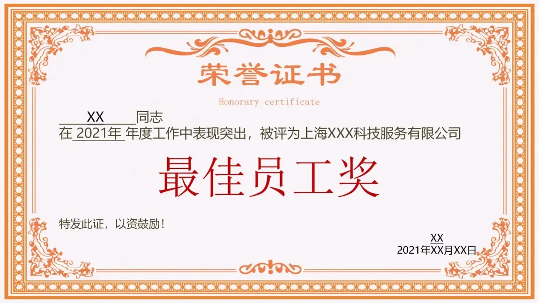 二、工作类荣誉证书:包括优秀员工、先进工作者、年度杰出贡献奖、优秀团队成员、岗位能手、服务之星、最佳新人奖、敬业奉献奖、优秀管理者、突出贡献奖、优秀志愿者、年度创新奖、安全生产先进个人、优秀组织奖等。