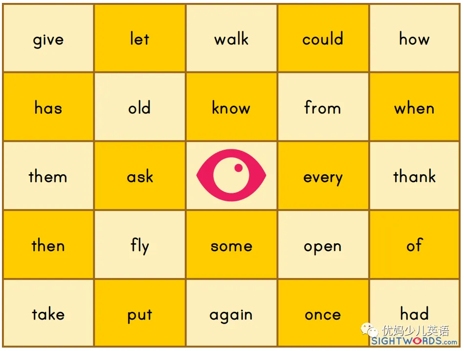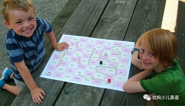 Bingo是北美最流行的游戏了。将Sight words做成成5*5的表格,然后家长或者老师拿着单词表随机说出其中一个单词,最好再造一个句子。