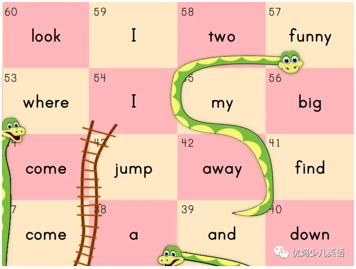 这个游戏需要骰子和两枚”棋子“,两个人一起玩,骰子摇到几,走几步棋子,然后说出对应单词,遇到梯子可以”爬”上去,如果不幸遇到蛇头🐍就得”滑“下来啦。