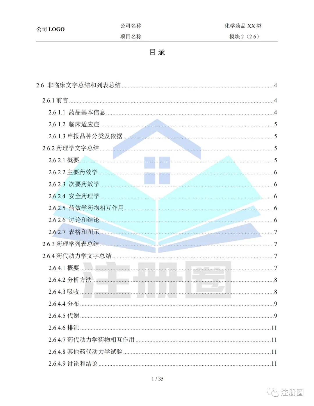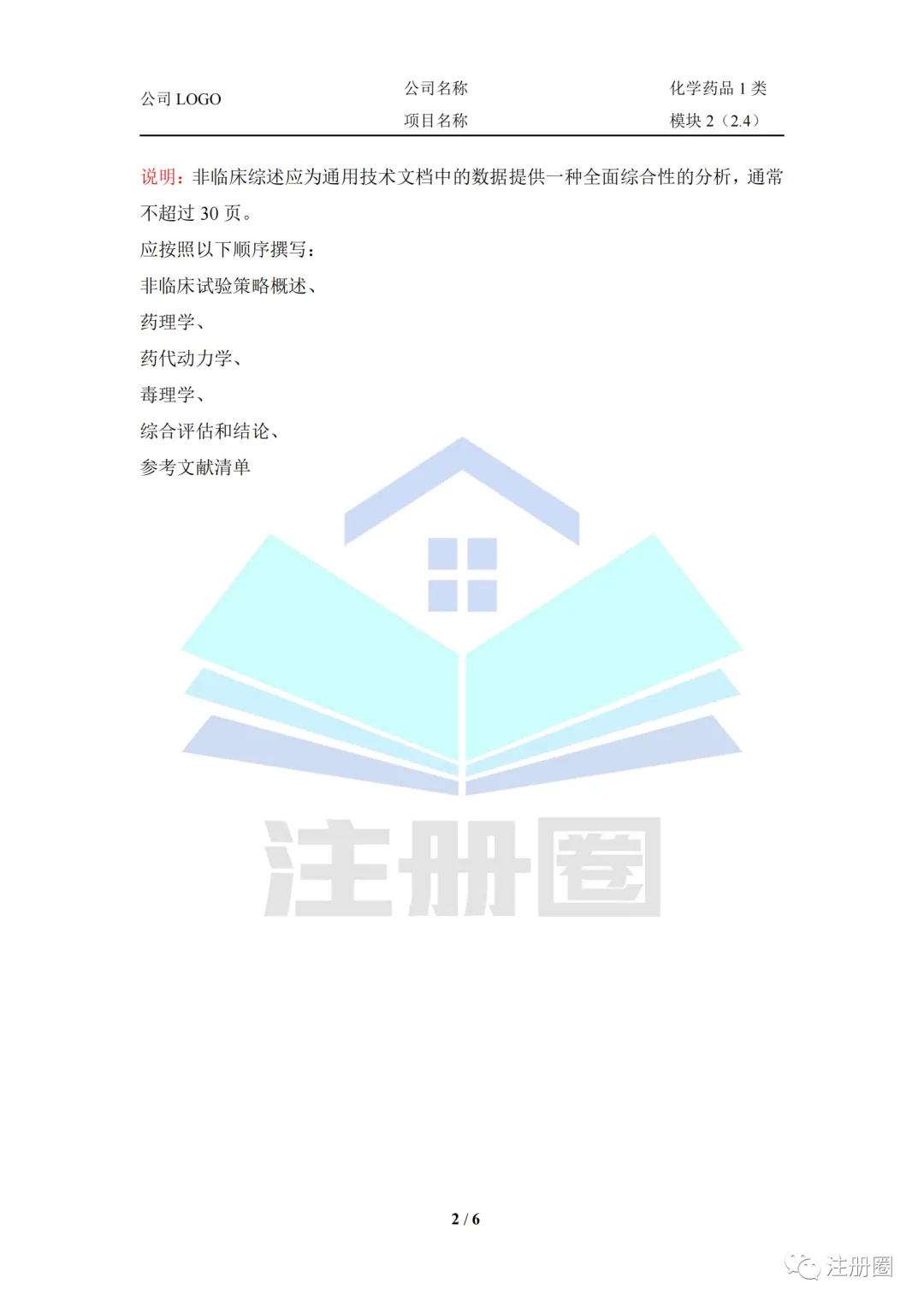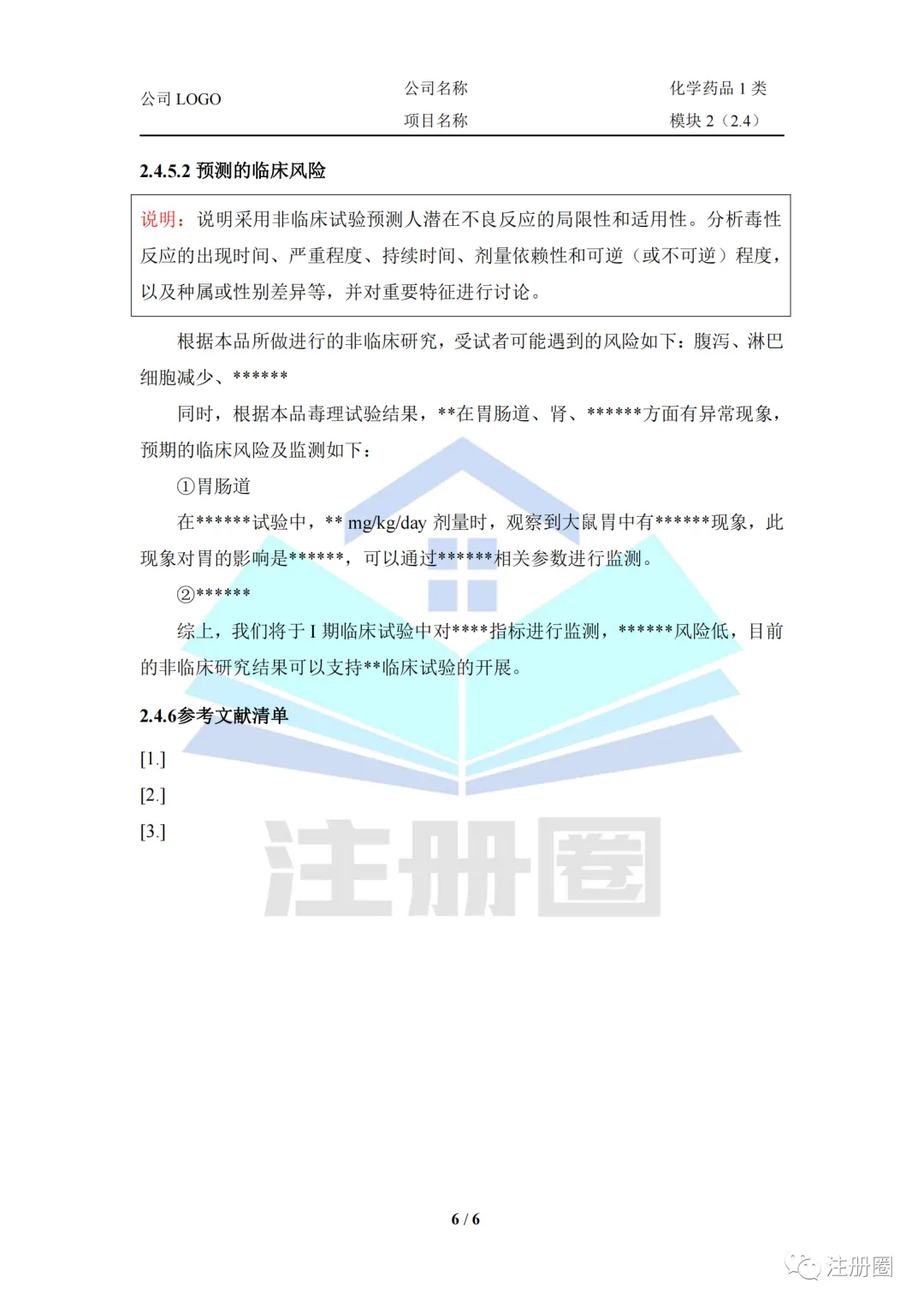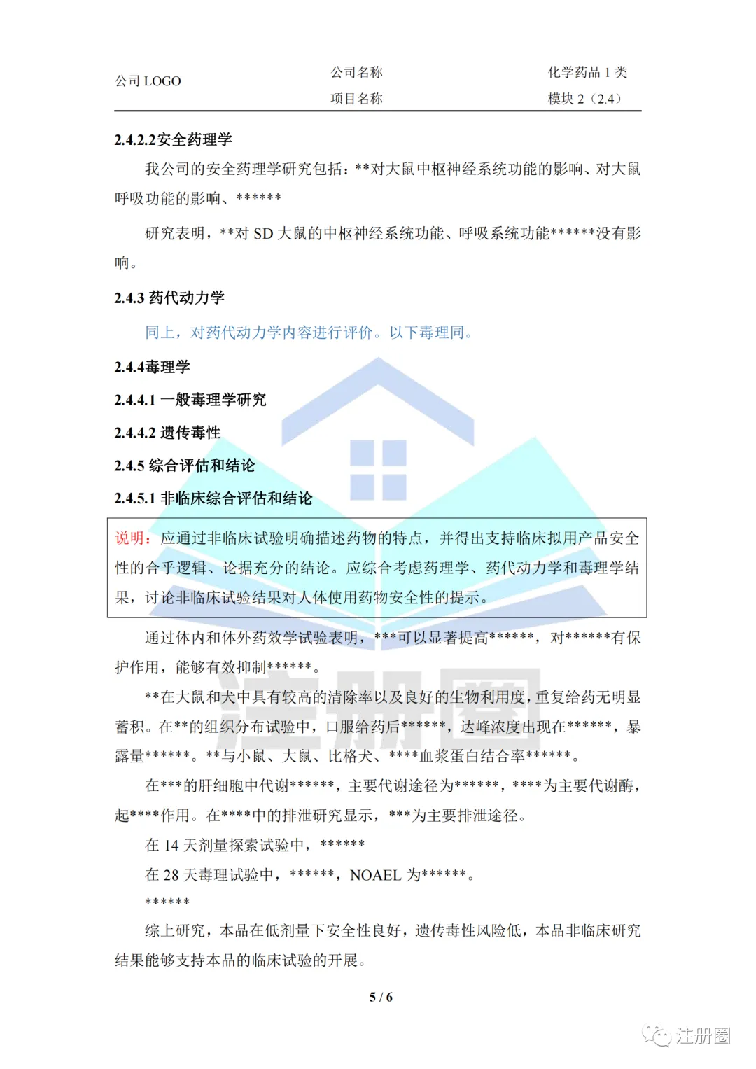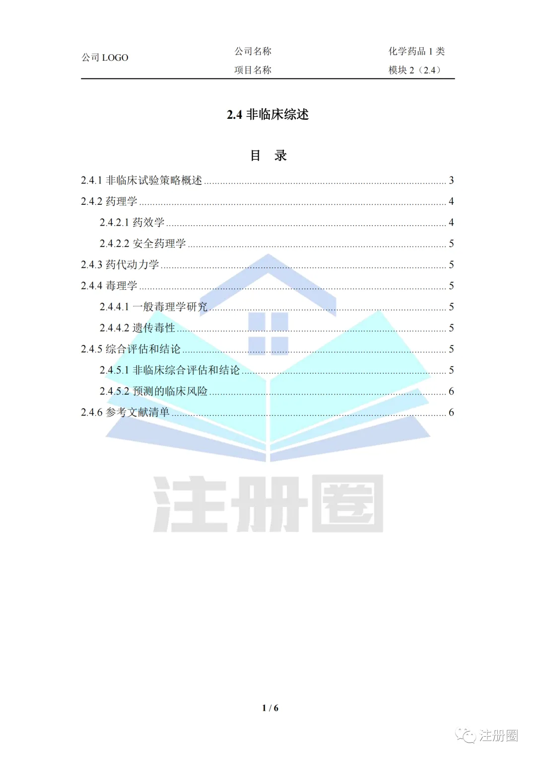 2022年2月,注册圈整理发布了化药4类上市申请模块2的模板。对于创新药IND申请而言,非临床综述和总结部分有很大的差异。非临床综述是对药物药理学、药代动力学、毒理学研究的综合并且重要的评价。非临床总结则是采用可接受的格式撰写非临床药理学、药代动力学和毒理学文字总结和列表总结。通过非临床综述和总结,应能得出支持临床拟用产品安全性的结论,故这部分内容十分重要。