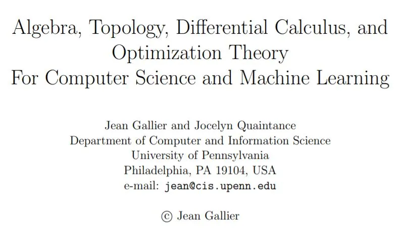 宾夕法尼亚大学计算机和信息学教授Jean Gallier就与他人合作编撰了一部“面向计算机和机器学习的数学全书”。这着实是本大部头,全书共计1900多页,涵盖了机器学习和深度学习相关的多个数学学科,包括线性代数,拓扑学、微分计算和最优化理论等。这本书的PDF电子版现已放出,需要的读者可以免费下载。