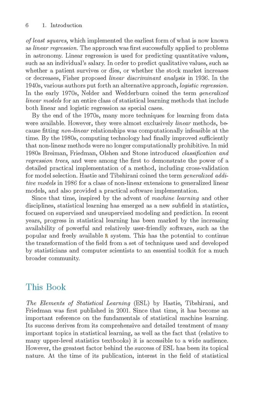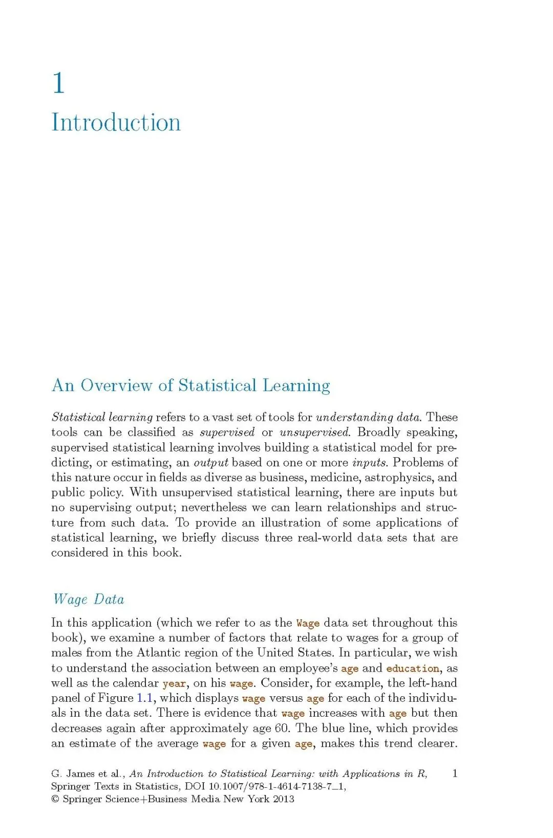 An Introduction to Statistical Learning with Applications in R 是理工学院大二年级统计科学和数据科学专业的学生的必修课教材。这本书为统计学习领域提供了一个清晰的概览和强有力的工具,帮助读者去认识过去不同领域中涌现出的海量、复杂的数据,并使用先进的统计学习技术来分析和处理这些数据。