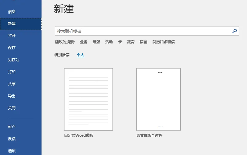 单击【文件】→【新建】,选择【个人】,我们就可以在这里快速找到自定义的Word模板了。单击一下模板图标,即可快速完成创建。