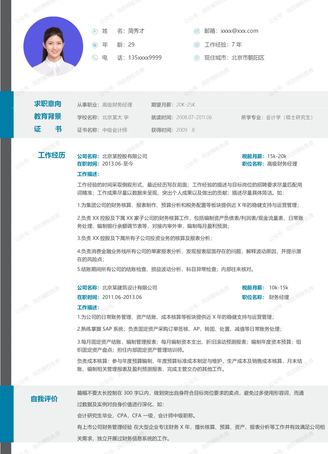 这份精美的简历模板免费资源采用了商务的灰色和青色,非常简洁好看,各个板块清晰明了,能让HR快速获取到你的信息,是一份专业的适用于各行各业求职的精美简历模板。
