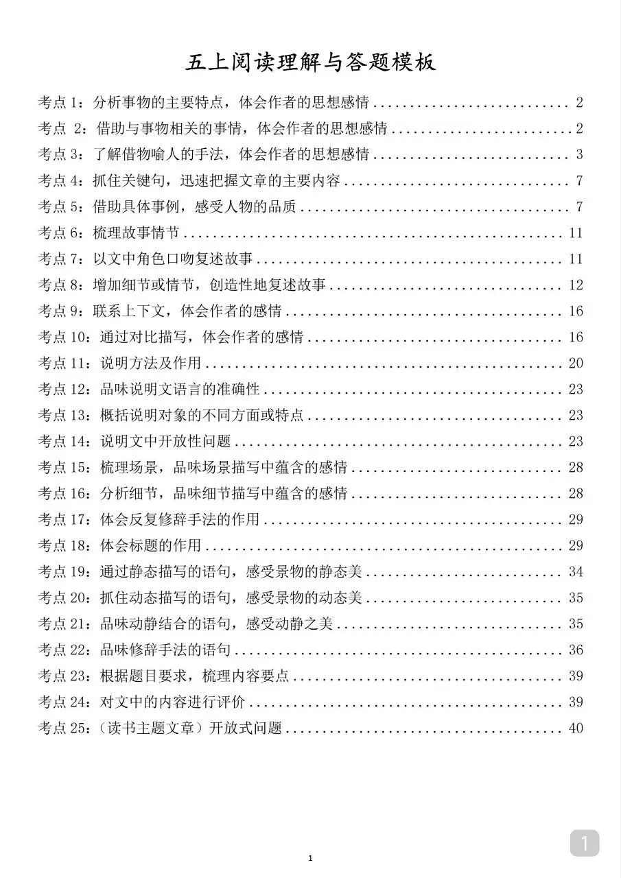 五年级(上)语文 阅读理解与答题模板.pdf篇幅有限,无法全部展示。请按照文末方式领取,无门槛永久免费,欢迎转发,帮助更多有需要的人~温馨提示:文末有完整电子版领取方式!领取完整电子版:①:点一点右下角的“👍”和“❤️”②:在公众号对话框中回复“资料588”END