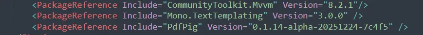 dotnet add package Mono.TextTemplating --version 3.0.0dotnet add package PdfPig --version 0.1.14-alpha-20251224-7c4f5
