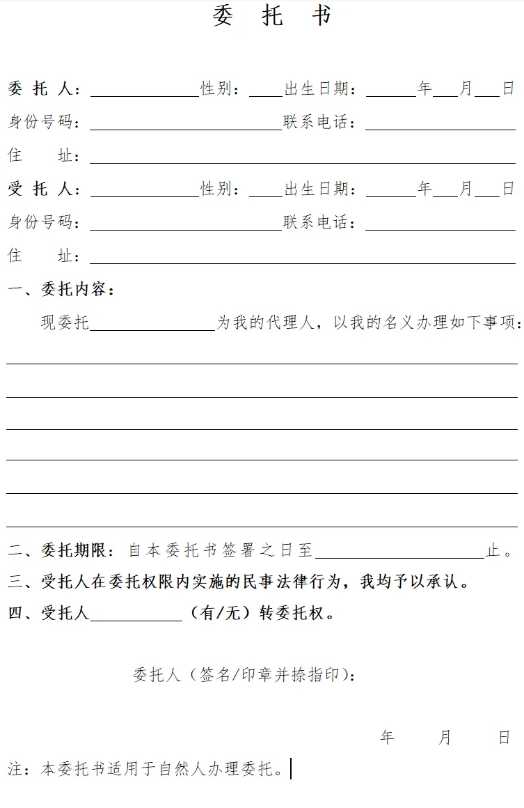 自然人委托书Word模板免费下载,打印即用:适用于房产过户、车辆业务、银行代办、诉讼代理、证件领取等多种个人事务委托场景电子版「自然人委托书.doc」,点击链接或复制整段内容,打开「夸克APP」获取下载打印。链接:https://pan.quark.cn/s/ed3c4140f2e0