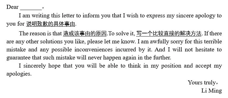 表示歉意+说明理由+提出弥补措施+请求原谅