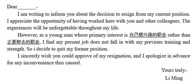 提出辞职+说明原因、表示遗憾或感谢+期盼回复