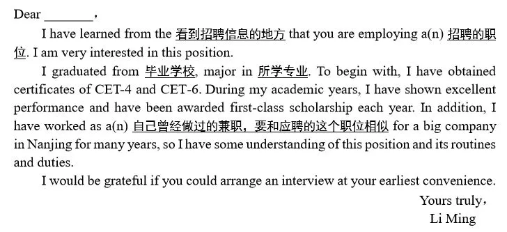自我介绍、说明求职原因+表示个人能力、经历及求职动机+希望取得面试机会、表示感谢
