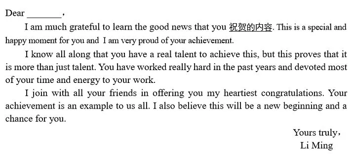说明事由并表达自己衷心的祝贺+展开评论事件、赞扬收信人+再次表达良好祝愿