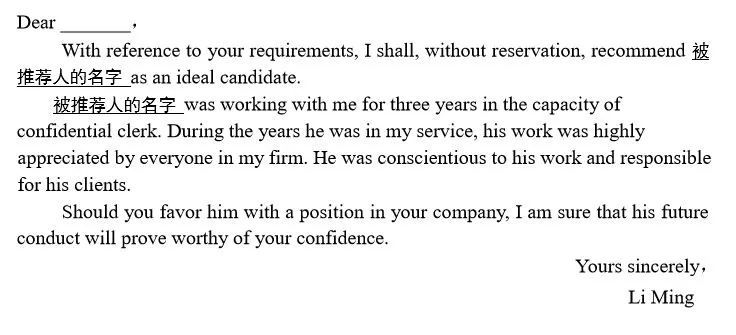 推荐人+推荐原因+表示会让对方满意并希望被接受