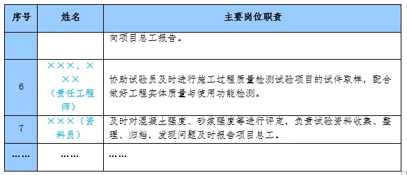 组员:×××(试验员)、×××(材料员)、×××(质量员)、×××(土建施工员)、×××(土建施工员)、×××(土建施工员)、×××(电气施工员)、×××(水暖施工员)、×××(资料员)等等(把本项目与试验、检验有关的人员都列齐全)。