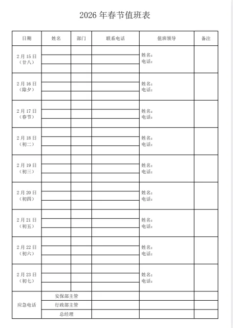 #值班表模板免费#春节值班表2026#2025春节值班表#春节值班表格式范本#过年排班表模板excel#一键生成排班表#春节值班记录表#春节排班表#最简单值班表模板#值班表模板格式