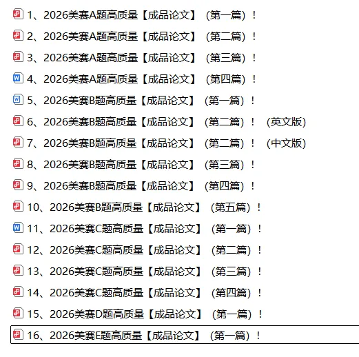 为帮助大家全力以赴迎战美赛,老哥把各赛题相关的【成品论文】都整理了出来,大家可以作为参考,由于内容较大,关注公众号【数学建模老哥】后台回复【2026美赛】即可获取!
