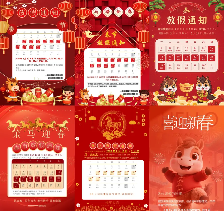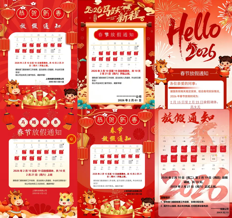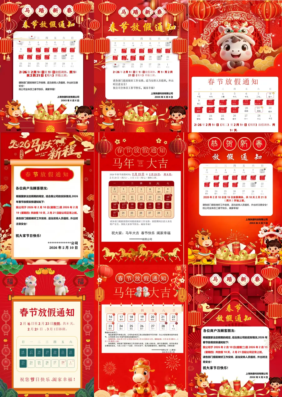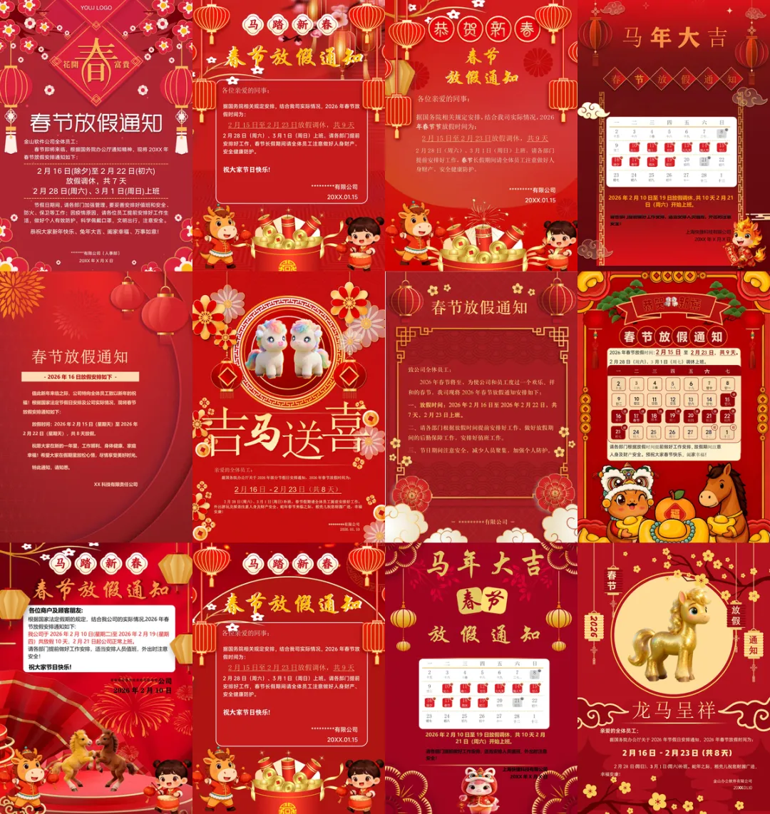 104款精选春节放假通知模板,涵盖红色喜庆、马年主题、灯笼烟花、卡通传统等多种风格,满足企业、学校、单位等不同场景的使用需求。