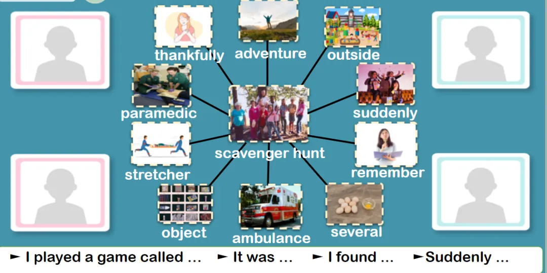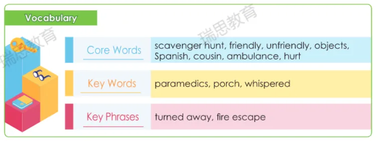 Core words:scavenger hunt寻宝游戏,friendly友好的,unfriendly不友好的,objects物品,Spanish西班牙语,cousin表兄妹姐弟,ambulance救护车,hurt受伤