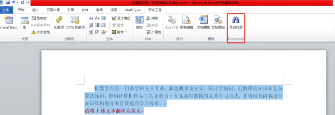 依据详细的操作指南一步步实施后,Word的界面上将增添一个专属于“开启对话”的功能按钮。这表示DeepSeek已被成功嵌入到您的Word程序中。然后选中文本点击“开启对话”,即可实现与DeepSeekV3进行对话。