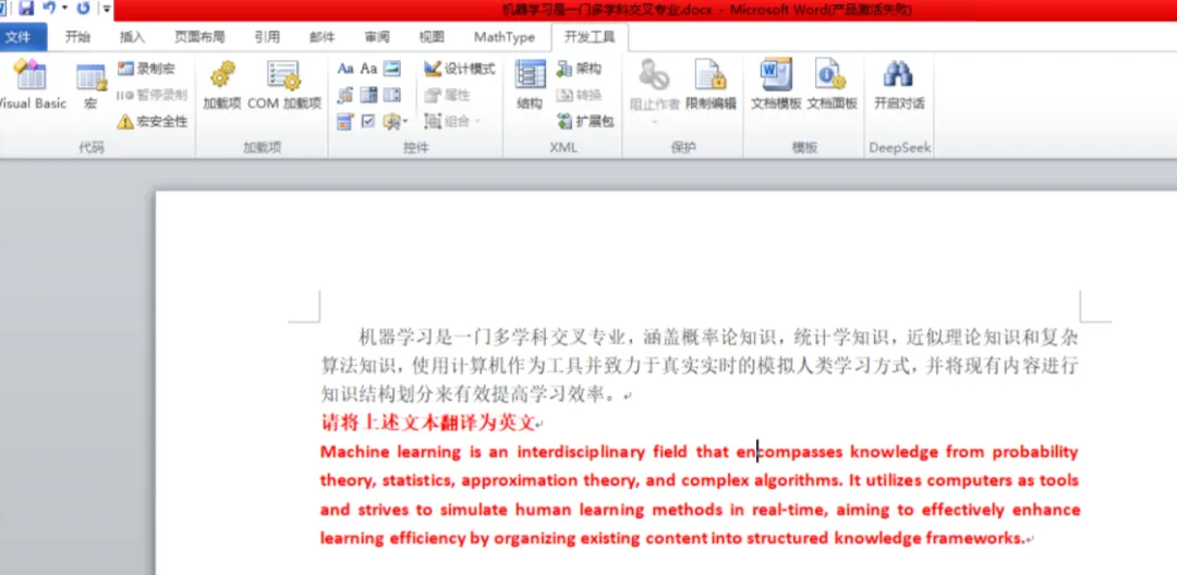 至此,我们已经成功的将Word接入DeepSeek大模型中了,接下来我们将验证一下配置是否成功。