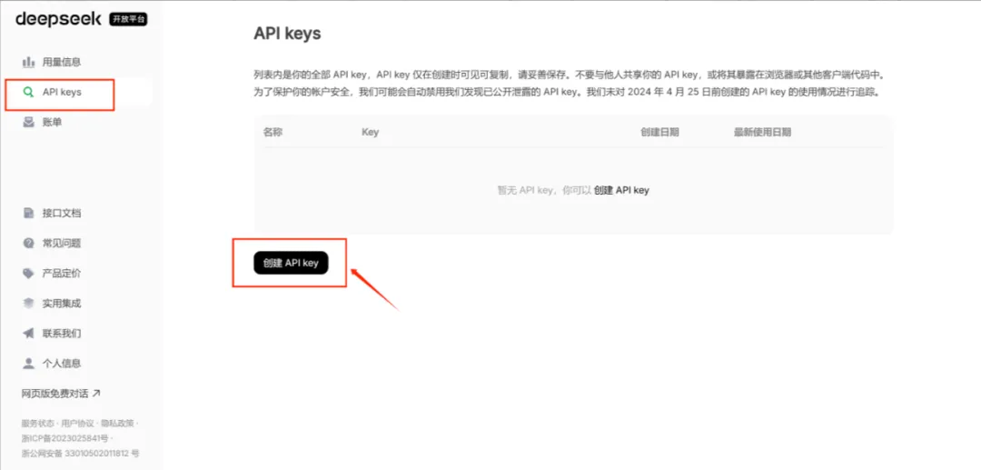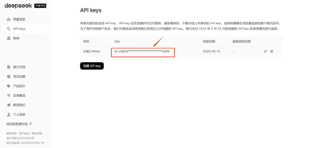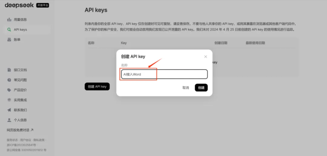 2、点击左侧”API Keys”,点击”创建API key",输出名称为“AI接入word”,当然也可以定义自己喜欢的名字。