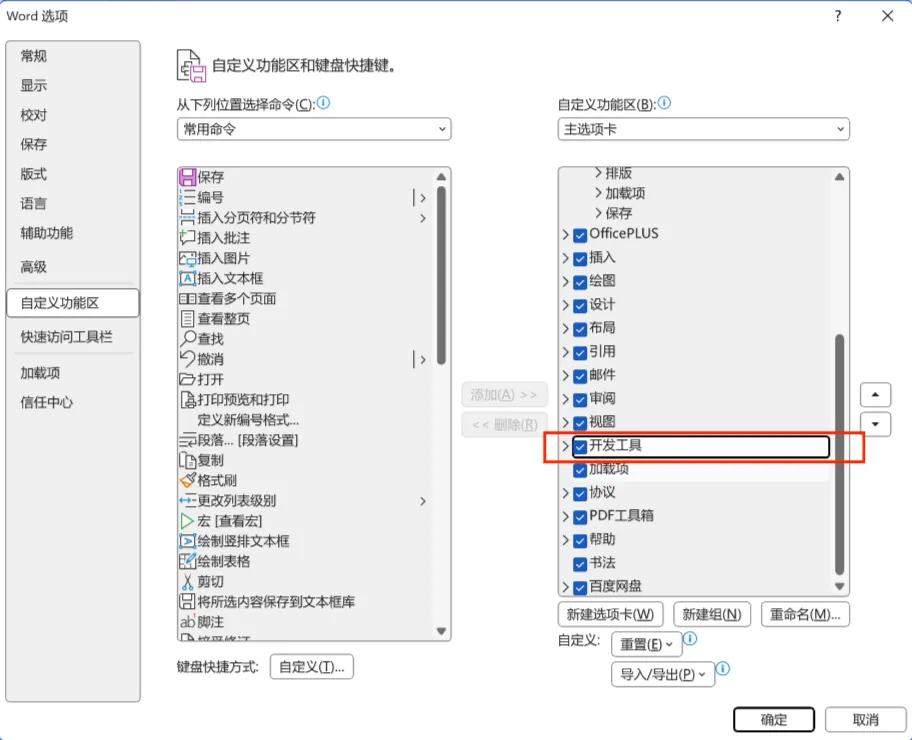 1、首先在自己电脑上新建一个Word文档,然后点击文件 -> 选项 ->自定义功能区,勾选”开发者工具”。