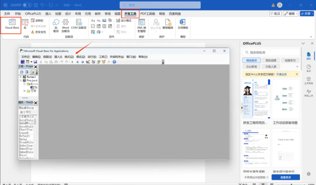 3、这时我们会发现word选项卡中出现了一个“开发者工具”,点击开发者工具,然后点击左上角的“Visual Basic”,会弹出一个窗口。