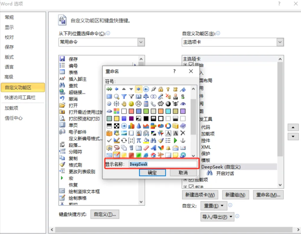 6、右键”新建组(自定义)”,点击”重命名”。将其命名为”Deepseek",并选择自己喜欢的图标,点击“确定”。