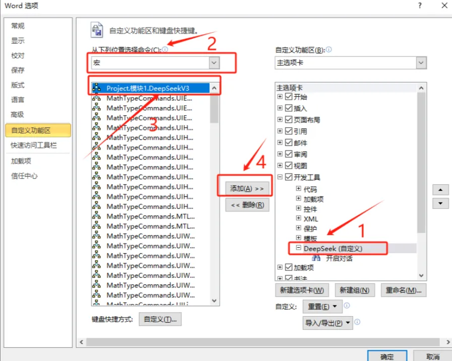 7、首先选择”Deepseek(自定义)”,选择左侧的命令为“宏”,找到要添加的“DeepseekV3”,选中后点击“添加”。