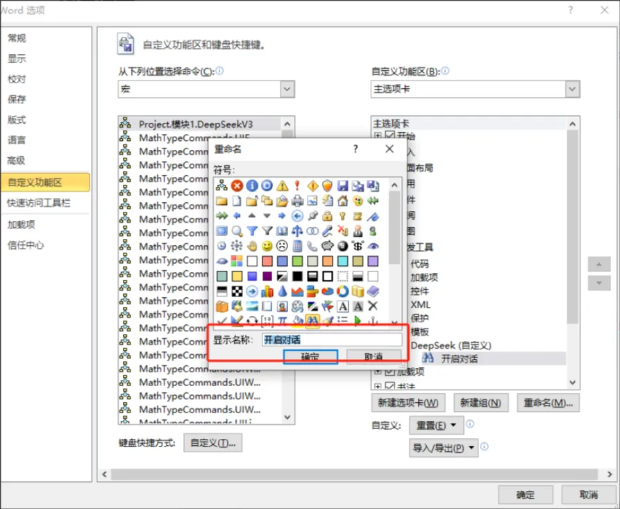 8、选中添加的命令,右键点击”重命名”,重命名为“开始对话“,并选自己喜欢的符号作为图标。