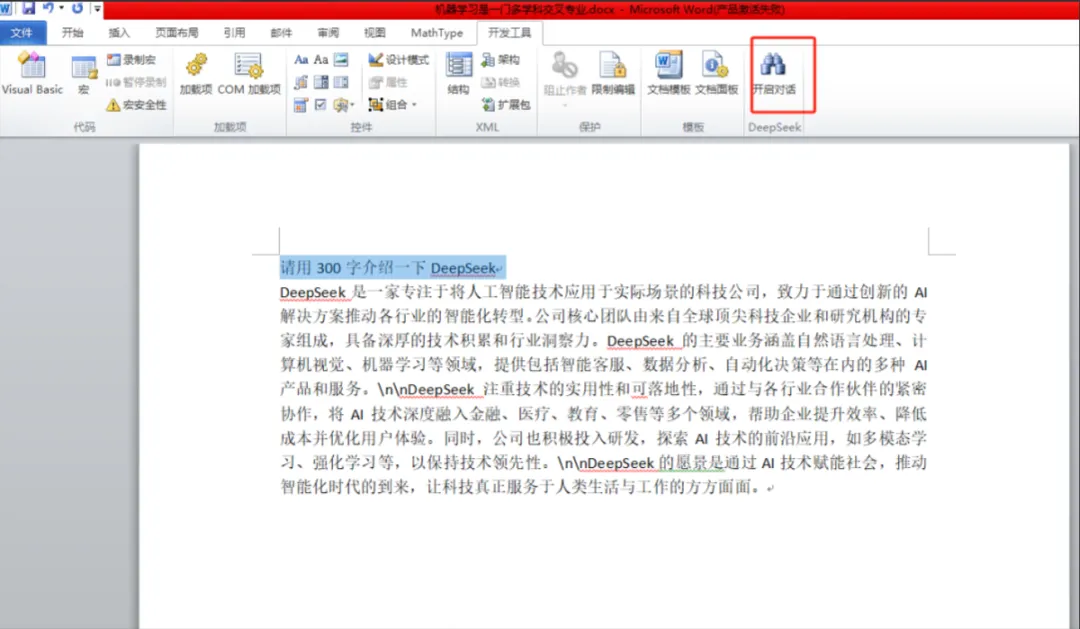 这时我们在word中,输入一行文字“请用300字介绍一下DeepSeek”,然后点击我们选型卡中我们命名的“开始对话”按钮,这时大模型会按照我们选中的文本给出相应的回应。