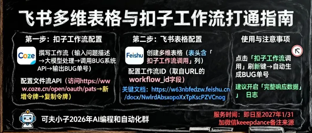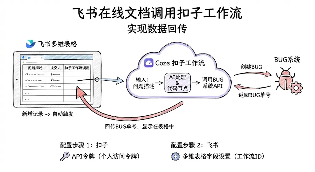 我有一个飞书多维表格里面,里面有问题list,每一行就是一个问题,当新增一条记录时,要自动把表格里面的数据,传到扣子工作流,工作流完成问题的初筛和分析,然后提到的BUG系统,创建一条BUG,并把这个BUG单号回传到工作流,显示在表格中。