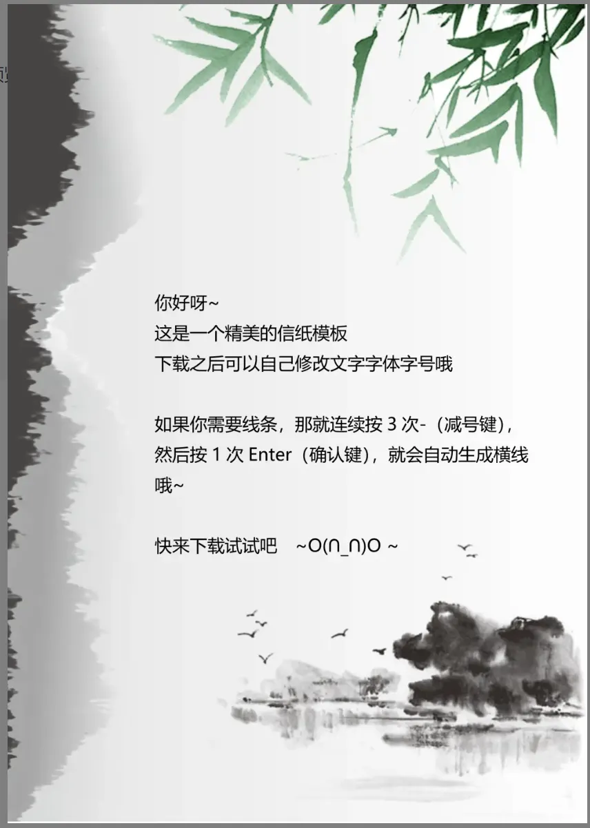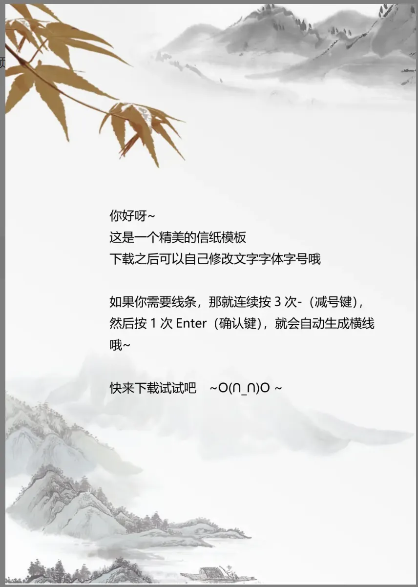 100套国风水墨word信纸模板点击【Yan789】- 右上角找到【…】 请设我为星标/置顶 - 不迷路哦~部分内容分享方式一资料下载链接:https://pan.quark.cn/s/f1c2a5690913下载方法:复制链接,打开夸克APP,转存就可以下载了方式二↓↓↓:长按识别↑↑↑更多ppt模板可关注下方公众号图片素材来源于网络,侵权请联系删除小贴士:喜欢记得点赞+点在看嗷~点击“阅读原文”下载完整电子版 记得给个点赞和在看