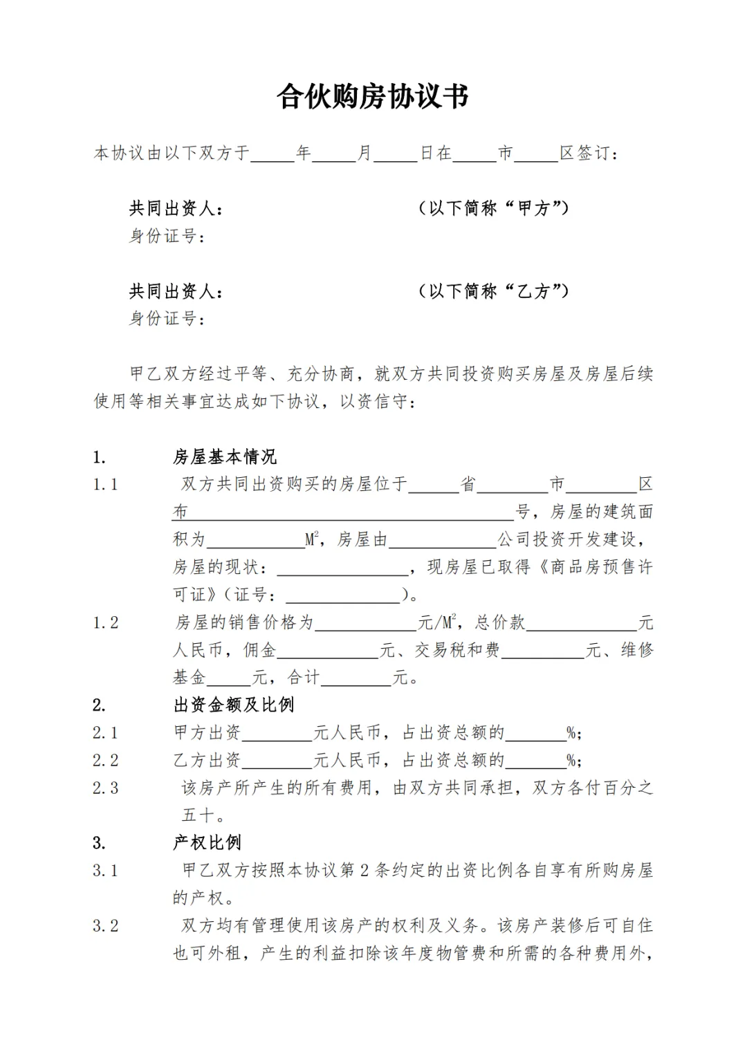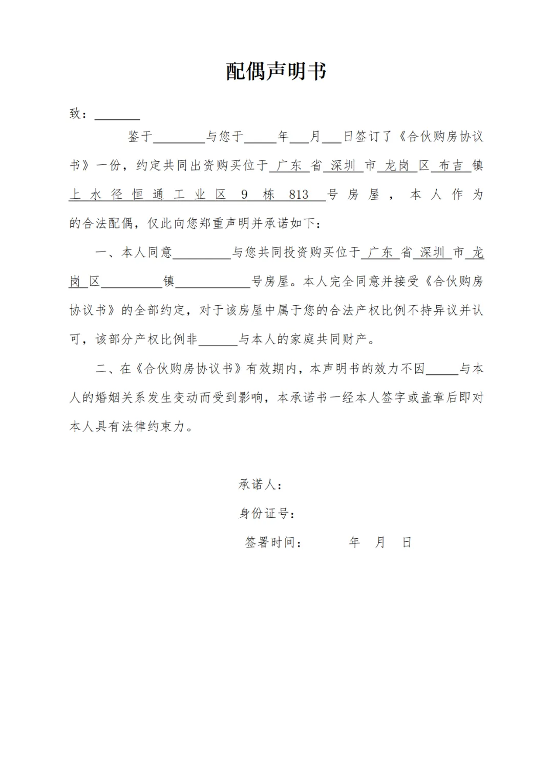 合伙购房协议书模板,含配偶声明书模板,WORD文档电子版,可免费下载打印