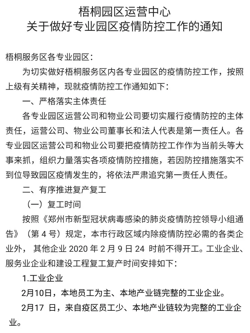 梧桐园区运营中心发布关于做好专业园区疫情防控工作的通知,工业企业、 服务业企业和建设工程需根据时间有序推进复产复工。