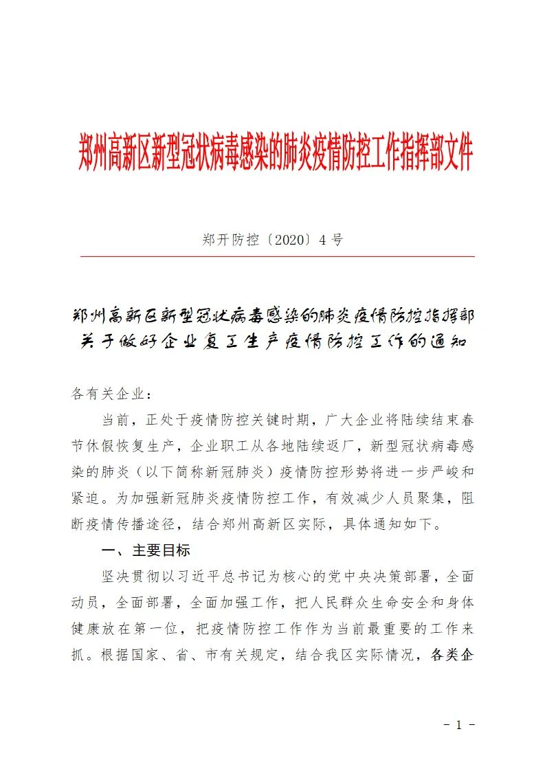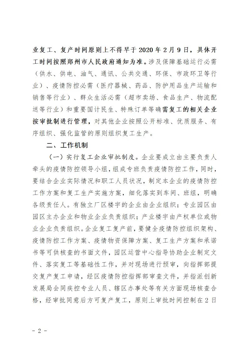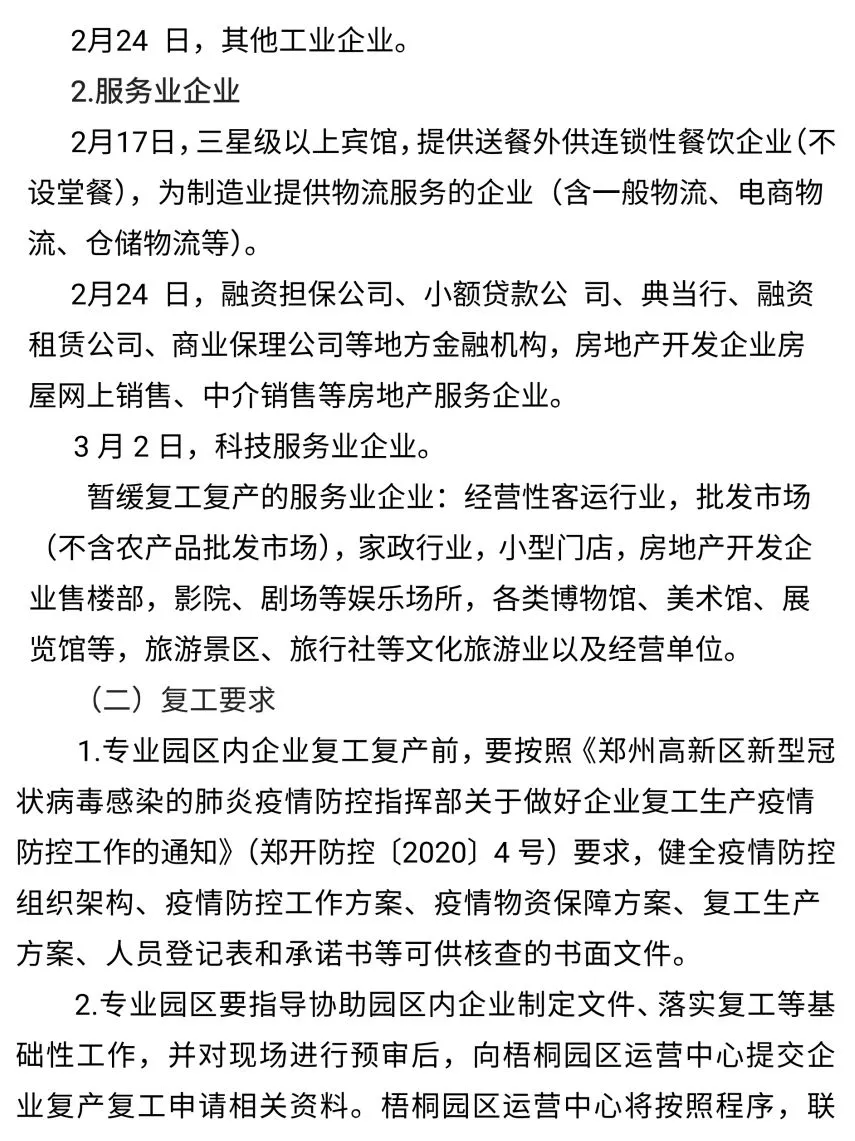 按照《郑州市新型冠状病毒感染的肺炎疫情防控领导小组通告》(第4号)规定,本市行政区域内除疫情防控必需的各类企业外, 其他企业2020年2月9日24 时前不得开工。工业企业、服务业企业和建设工程复工复产时间安排如下: