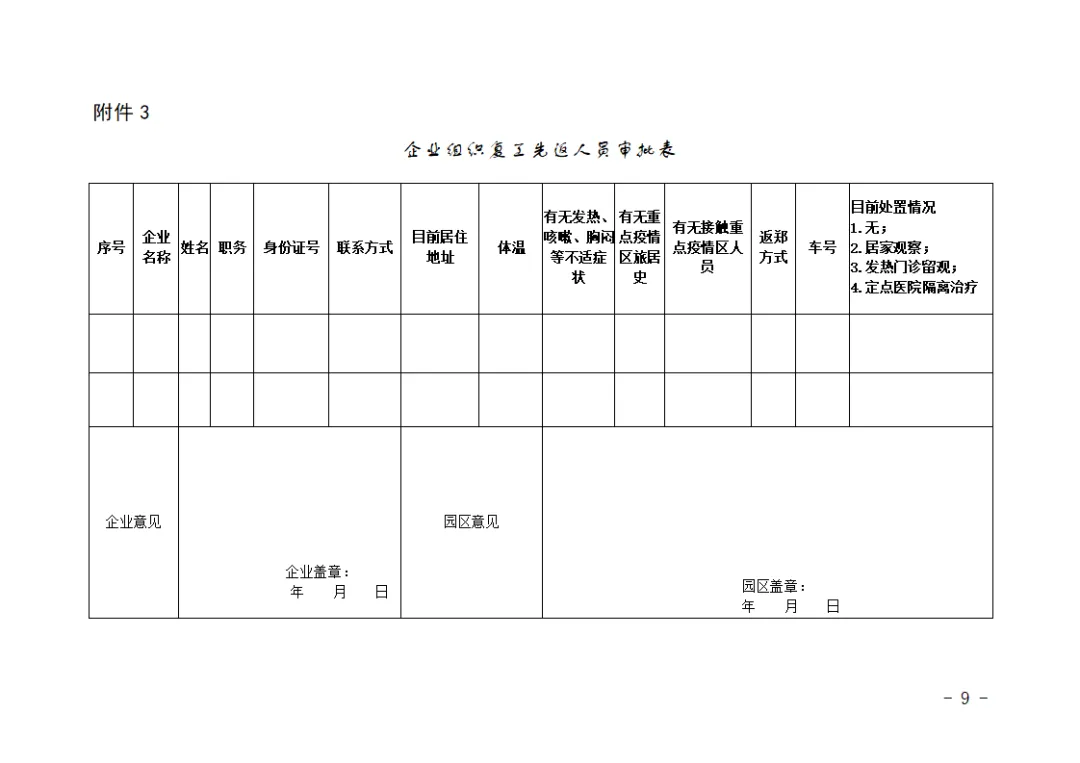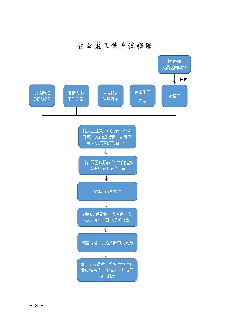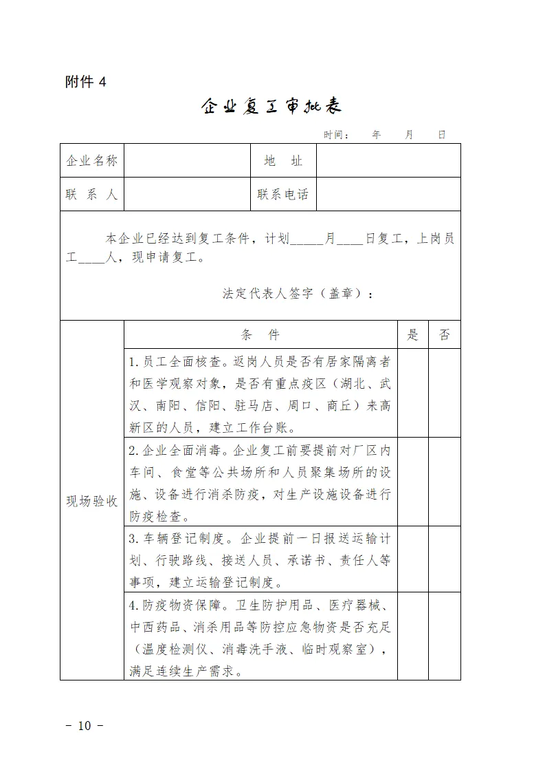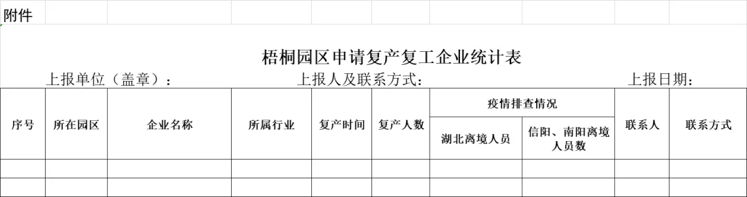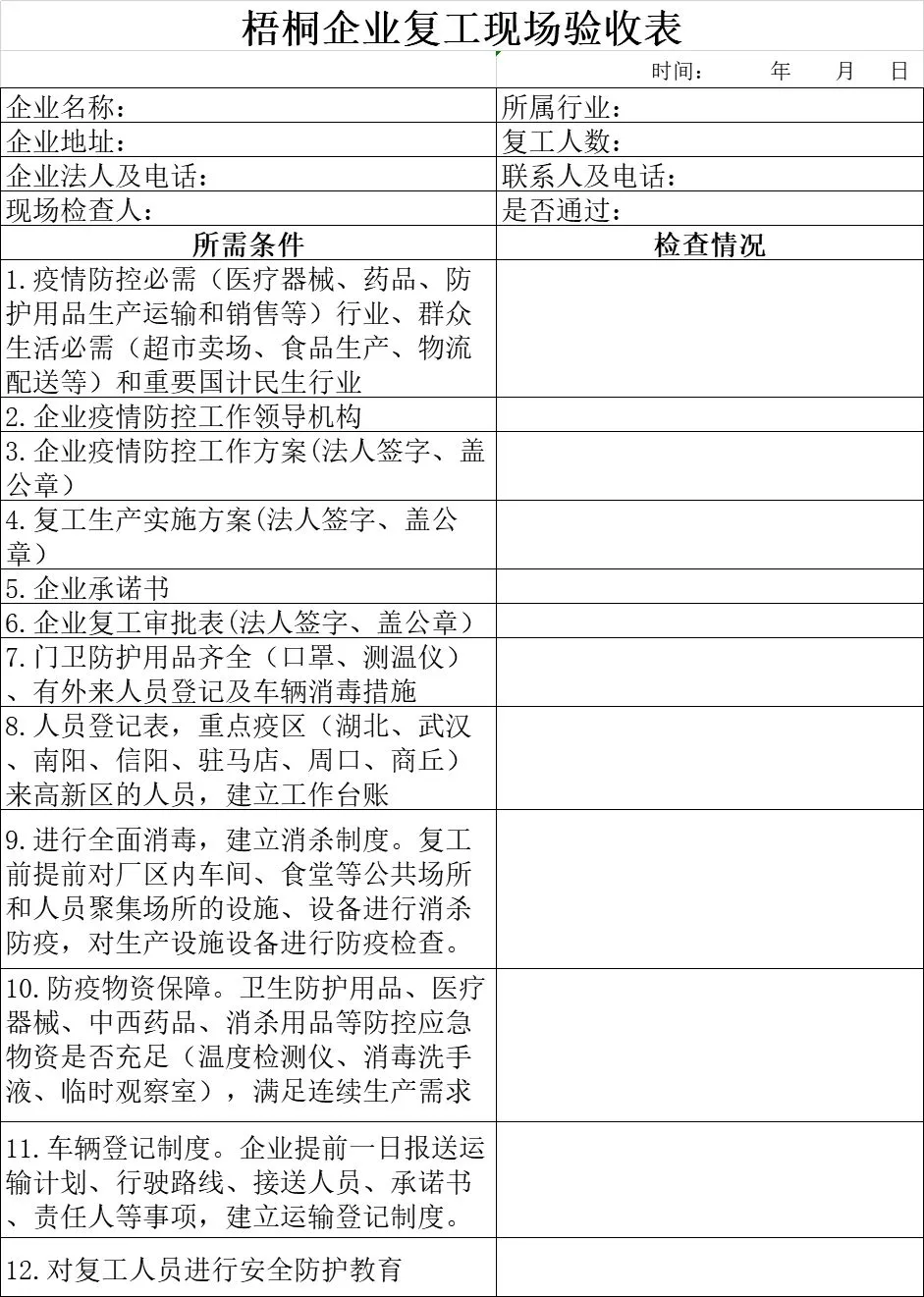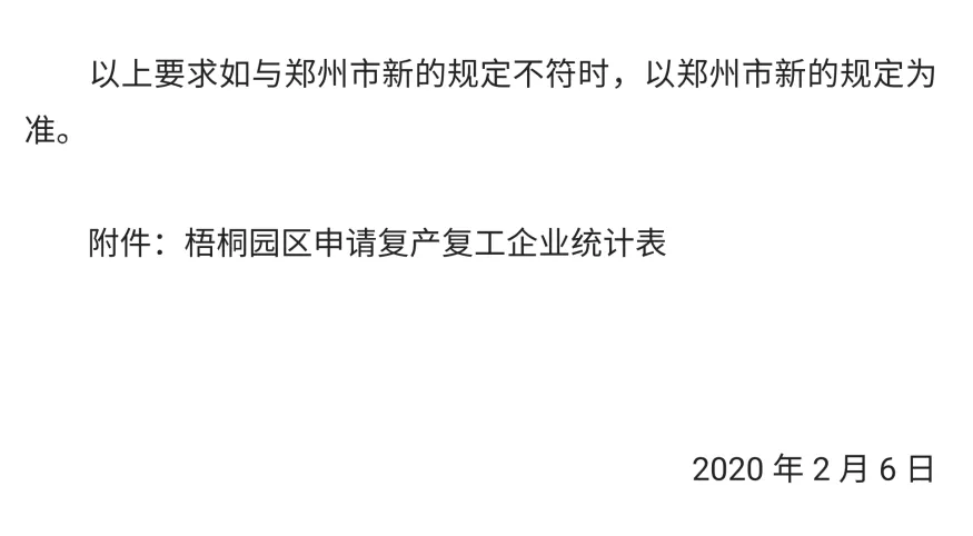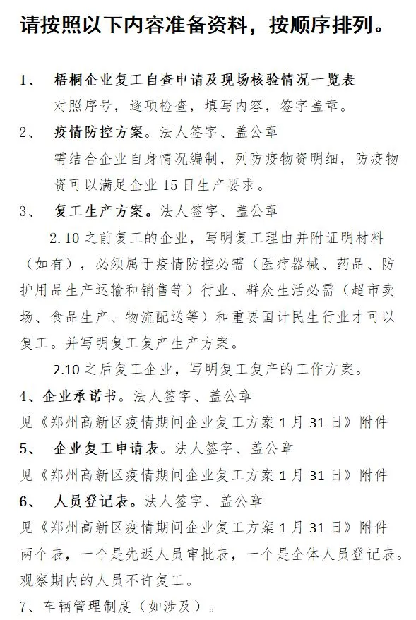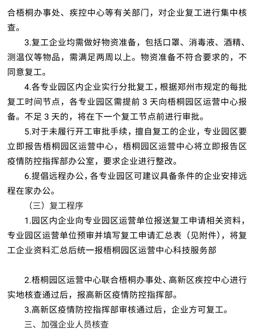 园区内企业复工前均需按照梧桐园区运营中心发布的《郑州高新区新型冠状病毒感染的肺炎疫情防控工作指挥部文件》填写复工申请,申请文件整理后同时发送至园区运营中心审核,申请通过后方可复工。