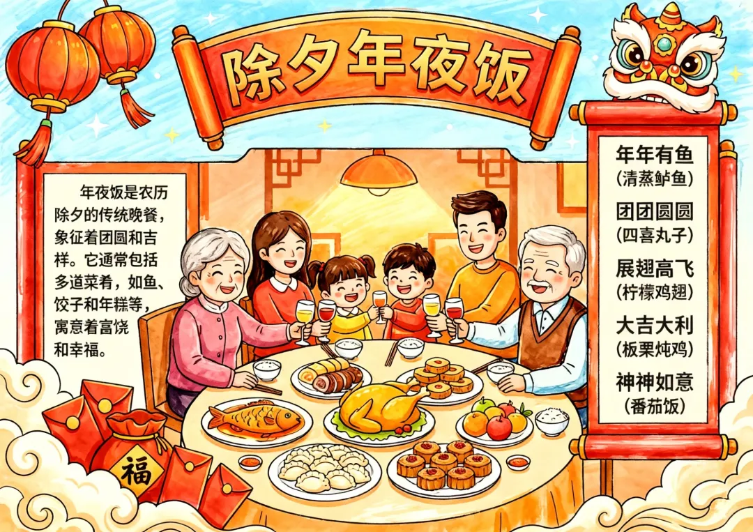 彩色卡通手绘除夕年夜饭小报手抄报