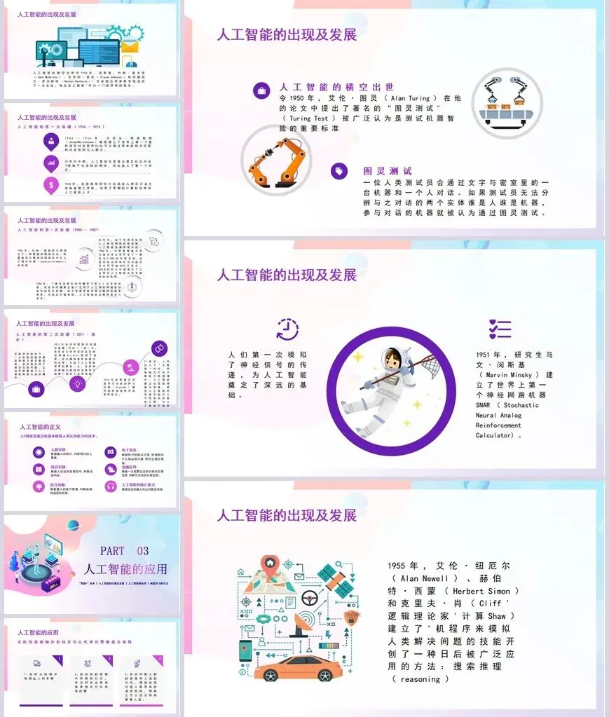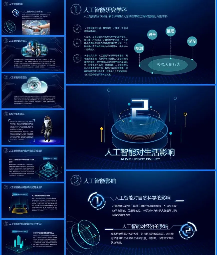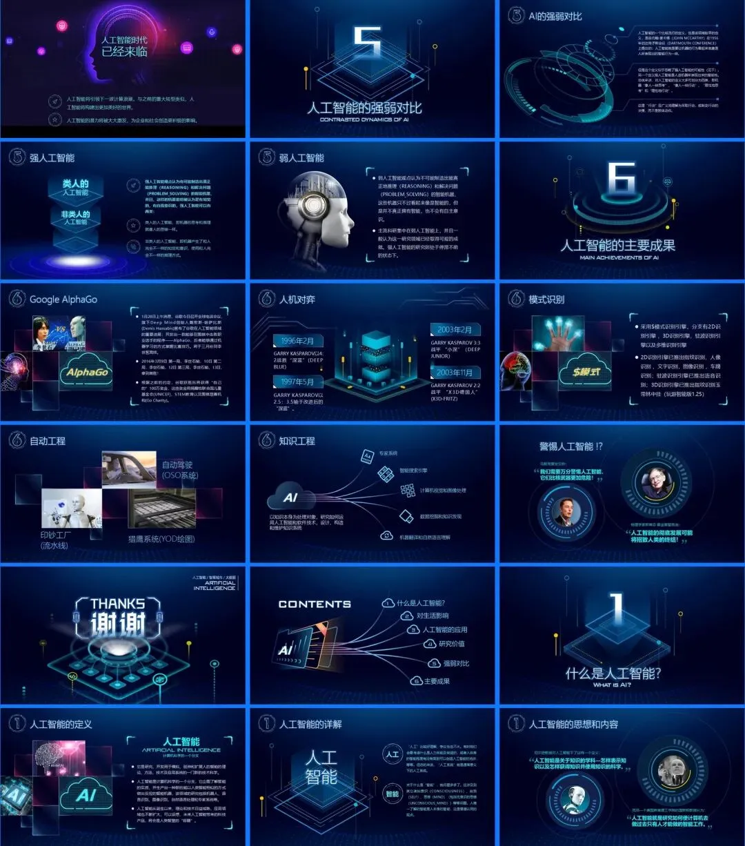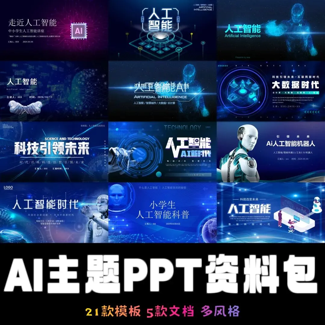 本合集包含21款人工智能主题演示文稿模板,涵盖多种视觉风格和适用场景。从星空背景到电路板纹理,从基础科普到前沿科技,满足不同受众的演示需求。