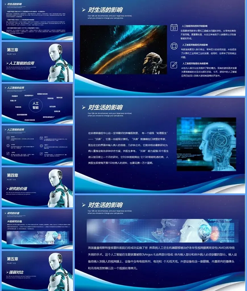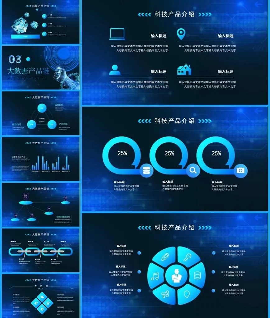 模板设计包含蓝色科技风格、紫色电路板风格、二进制代码背景、星空主题等多种视觉方案。每款模板都经过精心排版,配色协调统一,图表清晰易读。