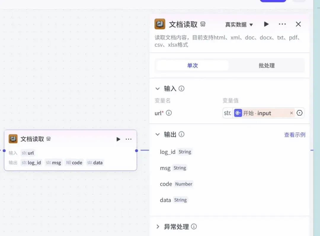 { "type": "coze-workflow-clipboard-data", "source": { "workflowId": "7592449072318414886", "flowMode": 0, "spaceId": "7520448293474811950", "isDouyin":false, "host": "www.coze.cn" }, "json": { "nodes": [ { "id": "172585", "type": "4", "meta": { "position": { "x": 640, "y": 25.999999999999964 } }, "data": { "nodeMeta": { "description": "读取文档内容,目前支持html、xml、doc、docx、txt、pdf、csv、xlsx格式", "icon": "https://lf3-static.bytednsdoc.com/...", "subtitle": "文件读取:read", "title": "文档读取" }, "inputs": { "apiParam": [ { "name": "apiID", "input": { "type": "string", "value": { "content": "7405805158996934683", "rawMeta": { "type": 1 }, "type": "literal" } } }, { "name": "apiName", "input": { "type": "string", "value": { "content": "read", "rawMeta": { "type": 1 }, "type": "literal" } } } ], "inputParameters": [ { "name": "url", "input": { "type": "string", "value": { "type": "ref", "content": { "source": "block-output", "blockID": "100001", "name": "input" }, "rawMeta": { "type": 1 } } } } ], "settingOnError": { "processType": 1, "timeoutMs": 180000, "retryTimes": 0 } }, "outputs": [ { "type": "string", "name": "log_id", "required":false }, { "type": "string", "name": "msg", "required":false }, { "type": "float", "name": "code", "required":false }, { "type": "string", "name": "data", "required":false } ] }, "_temp": { "bounds": { "x": 460, "y": 25.999999999999964, "width": 360, "height": 111.1 }, "externalData": { "icon": "https://lf9-appstore-sign.oceancloudapi.com/...", "apiName": "read", "pluginID": "7405805158996918299", "pluginProductStatus": 1, "inputs": [ { "description": "文档链接,不支持ip形式的资源链接", "name": "url", "required":true, "type": "string" } ], "outputs": [ { "name": "code", "type": "float" }, { "name": "data", "type": "string" }, { "name": "log_id", "type": "string" }, { "name": "msg", "type": "string" } ], "description": "读取文档内容,目前支持html、xml、doc、docx、txt、pdf、csv、xlsx格式", "title": "read" } } } ], "edges": [] }}节点信息解释说明