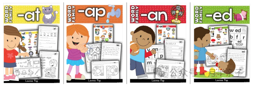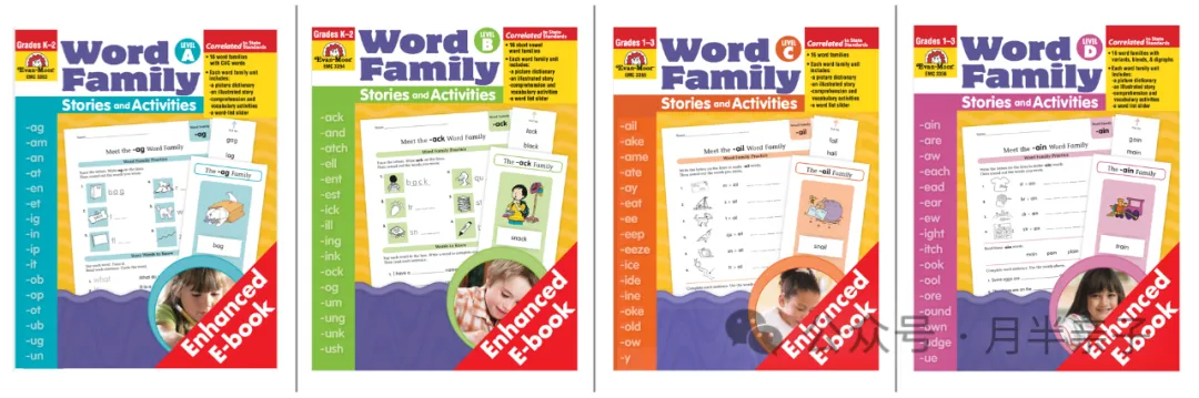 下面这套Word Family系列练习册内容详实、形式多样,并与美国的共同核心课程标准(Common Core State Standards ,CCSS)紧密结合。这套练习册分为4个等级,覆盖了64个词族的学习内容。