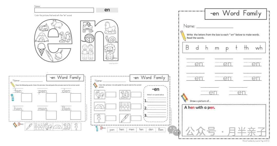 按照词族的种类整理成了资源包。这套资源包里一共有15本练习册,分别覆盖了an, ap, at, ed, en, et, ig, ip, it, og, op, ot, ug, um, un这15个词族,适合幼儿园(预备)和一年级的孩子使用。
