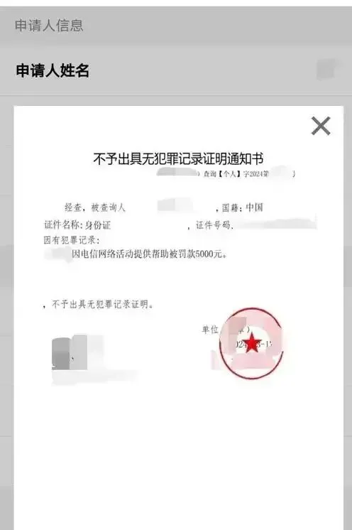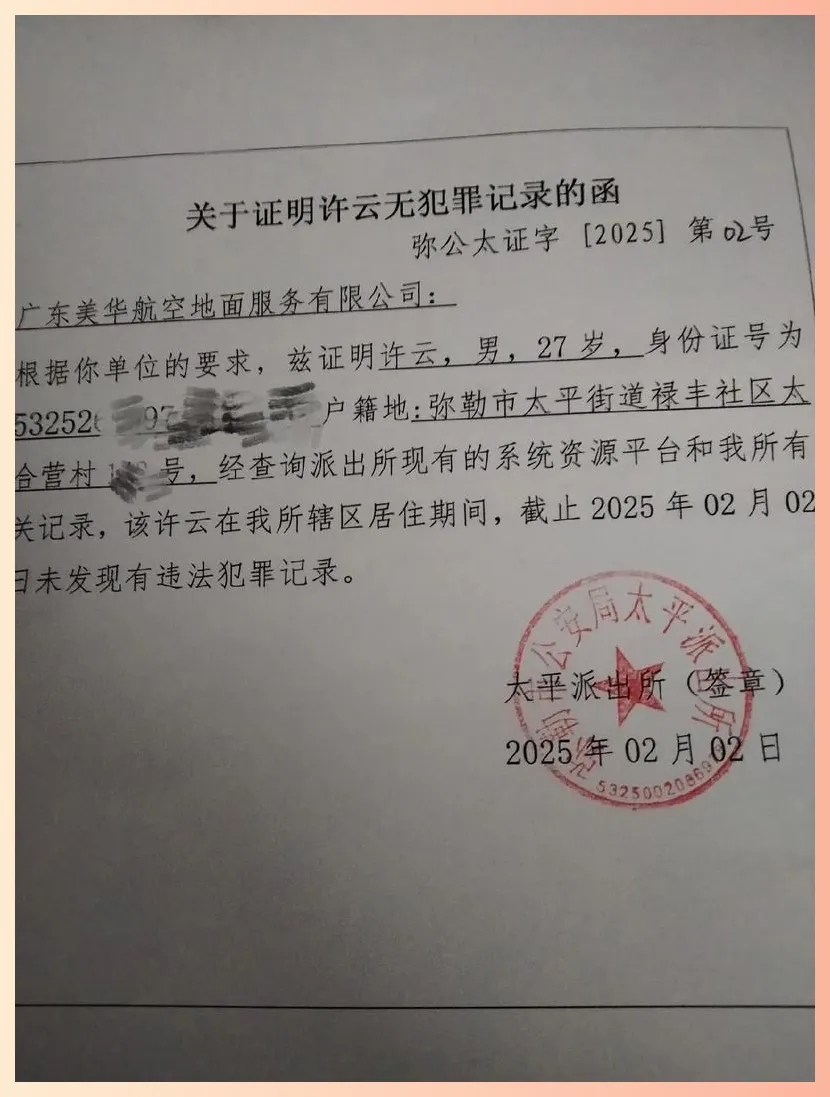 证明内容:包含你的姓名、身份证号、户籍地址、出生日期,以及核心的一句话:”经查询,该人在我辖区内无刑事犯罪记录”。最后加上公安机关的公章和出具日期。