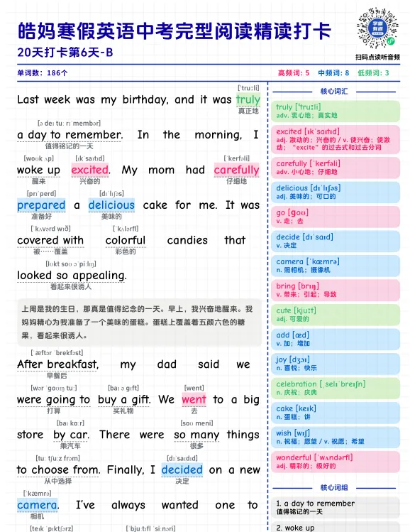 寒假英语学习(中考单词和完型阅读理解精读)day5-6 按步骤学习第一步:单词学习1、通过音标去熟读单词,图形和中文结合去记忆(熟读2-3遍)第二步:语境中学习单词和语法知识点(完成文件中内容)word版本中可以自己挖空,让孩子重新做填空,PDF可用作打印学习第三步:每日早读熟读2遍+反复多次熏听磨耳朵PDF可以打印,视频可以播放音频,也可以PDF中扫码听音频第四步:默写单词(资料均可打印)以上四个步骤是精读精学,基础好的孩子可以快速,每天看完知识点,熟读,熏听,默写单词是常规的学习日常。以上学习资料包,每日发到付费社群里更新,寒假20天更新完,大家可以根据自己节奏来学习。适合的孩子:小学高年级+初中生(寒假中考单词和完形填空精学)想要寒假一起学习的:1、付费公众号付费集合点击下面这篇2024文章拉到最后集合详情付费13年创业的感悟:把公司干垮后,我才看懂教育:如何点燃孩子学习热情?我的答案:先帮他赢一次2、扫描进付费社群