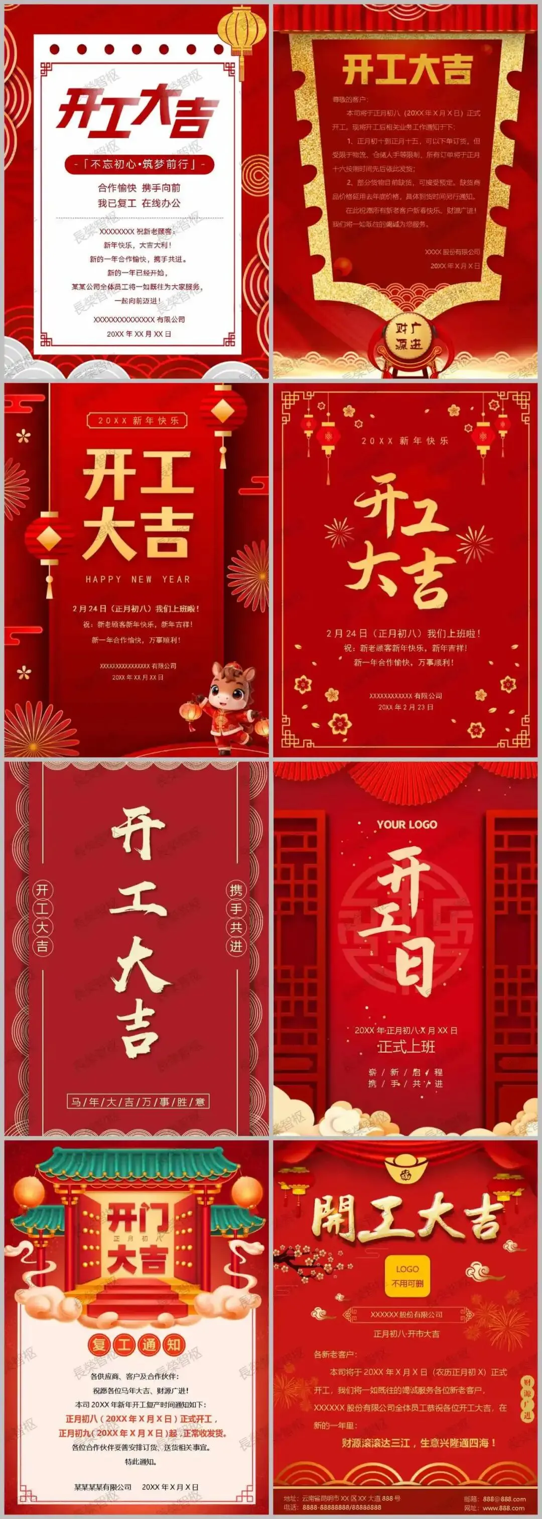 考虑到ps使用麻烦,特意提供了word模板的,方便无需专业设计能力的朋友使用,双击即可修改文字、替换公司名称、调整日期,wps/office即可搞定,打印/电子版发送均清晰美观。全红色喜庆风格,融入马年骏马、福字、红灯笼元素,贴合春节后开工氛围感,覆盖公司企业店铺通知、客户告知、办公海报等适用场景。公司企业店铺内部外部复工通知、明确复工时间、简洁规范。同时还有word版纯海报设计,突出“开工大吉、马到成功”主题,适合朋友圈、客户群宣发。