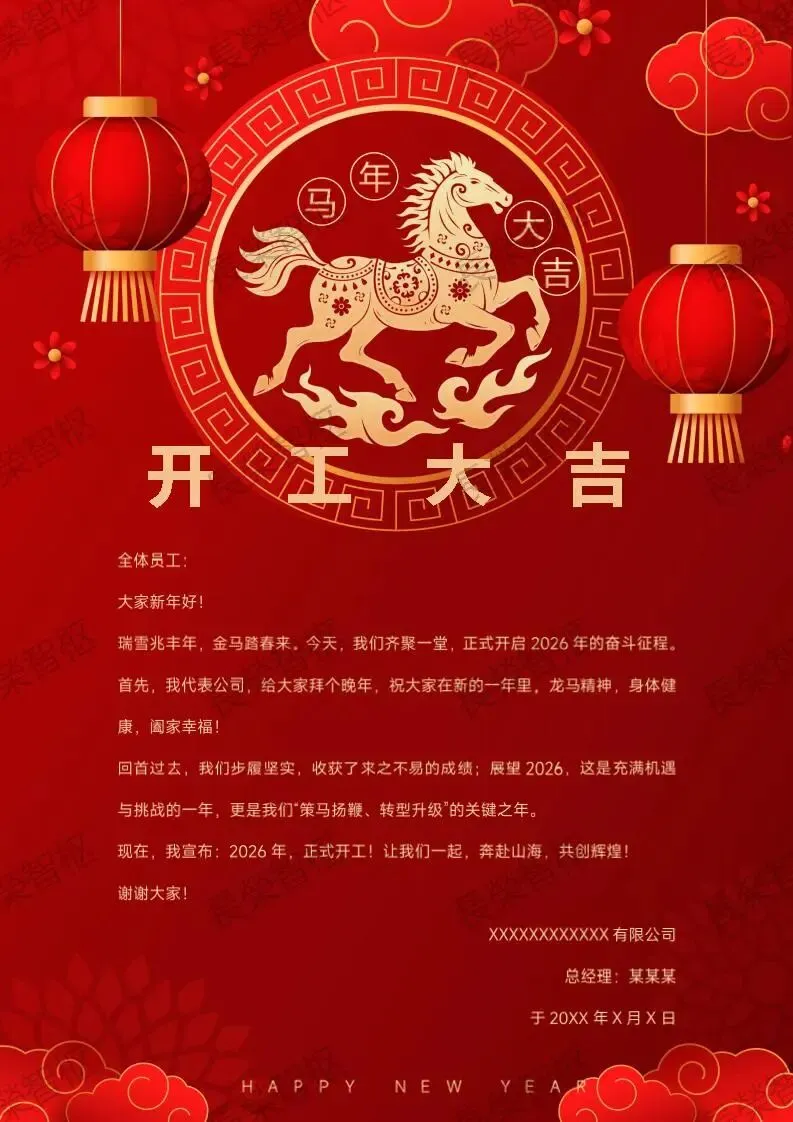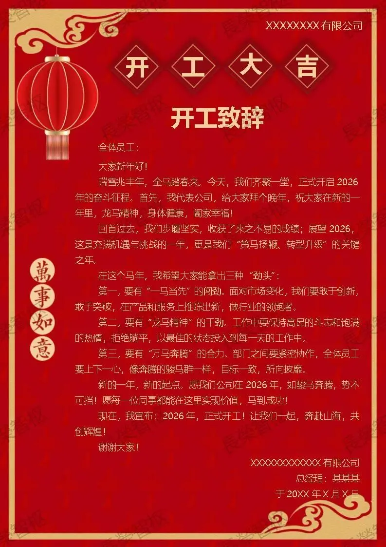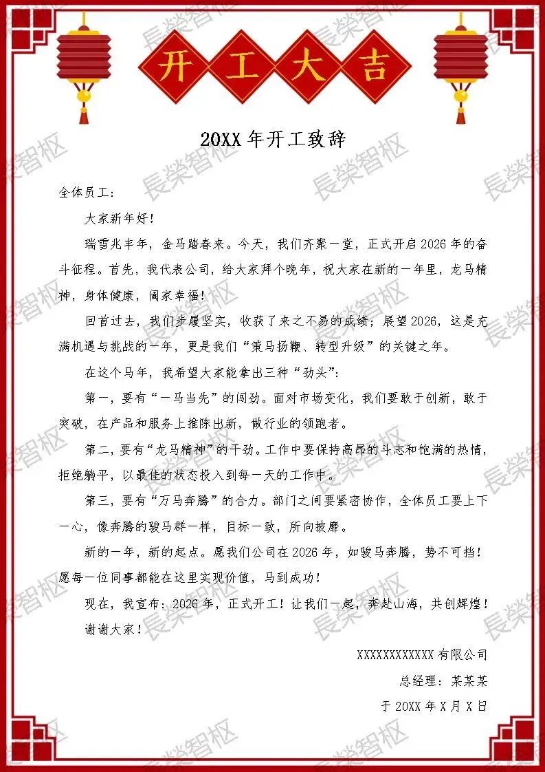 【Word模板】红色喜庆新春节复工开工致辞领导讲话致辞可编辑关注公众号后,在对话框回复“致辞”免费获取!红色喜庆新春节复工开工致辞领导讲话致辞可编辑word模板4份:简单易修改,不会设计,不会Photoshop也能轻松搞定,几分钟就能搞定高端大气的开工致辞,省去撰写、排版、设计的烦恼