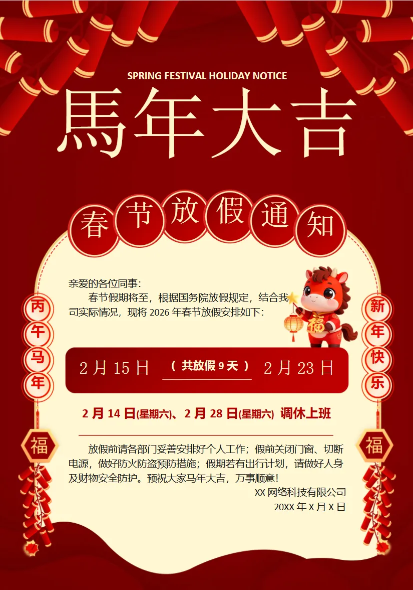喜庆中国红2026马年春节放假通知.docx